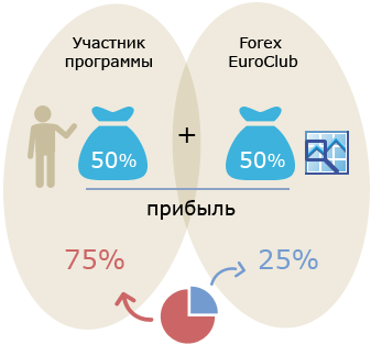 Как только Вы решите принять участие в программе доверительного управления Forex Euroclub добавит на Ваш счет ровно столько денег, сколько на нем уже лежит. Т.е. Forex Euroclub делает инвестиции в Ваш игровой депозит по принципу 50/50. Прибыль же от инвестиций распределяется в соотношении 25/75 в Вашу пользу.