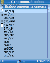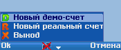 Меню возникает на экране при нажатии на одну из софт клавиш на вашем мобильном телефоне. Меню позволяет вам либо совершить какое-то действие, либо осуществить переход в какой-либо раздел терминала mobileforex. Примерный вид меню показан на рис.