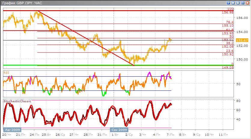 Валютная пара закончила свое нисходящее движение и отскочив от уровня поддержки пошла вверх, немного остановившись возле уровней 23,6 и 38,2% по Фибоначчи. Дошла до уровня 50% сейчас, испытывает это сопротивление и скорее всего дальнейшее движение будет направлено вниз к 23,6%. Эту ситуацию подтверждают и другие индикаторы такие как Stohastic, который сейчас пересекся в районе зоны перекупленности и указывает, на то, что движение дальнейшее будет вниз, RSI подтверждает данную ситуацию, также выйдя из зоны перекупленности по направлению вниз. Насколько данная тенденция будет сохранена в дальнейшем сказать сложно, но скорее всего цель этой валюты это район 23,6% по Фибоначчи.