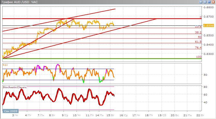 Австралийский доллар наметил себе возрастающий канал к уровню 0,8673 несколько раз ударился об него, но не смог его преодолеть. Сейчас мы будем наблюдать откат вниз к уровням 38,2 и 50% по Фибоначчи с прорывом восходящего канала вниз. Дальнейшее движение валютной пары также обусловлено другими индикаторами технического анализа, в частности RSI прорисовав две нисходящие вершины указывает на продажу данной пары. Что касается Stohastic-а, он тоже последовательно прорисовал у себя на графике две также нисходящих вершины и направляется вниз, что также указывает на скорую продажу.