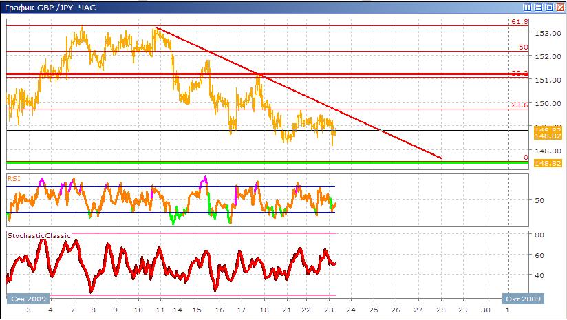 Сейчас валюта находится в нисходящем движении вдоль трендовой линии. Валюта пробивает предыдущую линию поддержки и отодвигает ее к уровню 147,44. Это подтверждается удорожанием йены по отношению к доллару США. Возможно данное движение будет продолжено до уровня поддержки. Пройдя нынешний уровень 23,6% по Фибоначчи она устремилась к 0% по Фибоначчи. Эти данные подтверждают и другие индикаторы Stohastic формирует разворот двух скользящих, но нельзя сказать что его сигнал достаточно силен, чтобы говорить и серьезном падении. RSI тоже разворачивается, но он это делает у линии 50 не дойдя до уровней перекупленности. Поэтому эта нынешняя тенденция требует серьезного подтверждения по экономическим новостям. Хотя возможен и сценарий разворота к уровню 38,2% по Фибоначчи в случае смены тренда у пары usd/jpy.