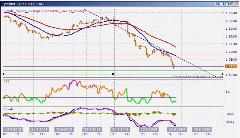 Начавшееся 23 сентября снижение, затем замедлившееся 25 сентября на уровне 1.5900, продолжило сегодня свое движение, пробив не только поддержку 1.5900, но и протестировав уровень 1.5800. Тем самым пара достигла уровней начала июня этого года. Картина по паре — ярко выраженный нисходящий тренд. Средние скользящие ЕМА21 и ЕМА55 более чем уверенно спускаются вниз, индикаторы MACD и RSI находятся глубоко под своими центральными линиями. При этом индикатор RSI находится в зоне перепроданности, так что возможен краткосрочный рост пары. Движение вверх нацелено на 1.5900, подняться выше будет, вероятно, трудно из-за сопротивления ЕМА55 и нисходящей линии тренда. Движение вниз будет направлено на пробой 1.5800 и закрепление под ним. Далее — к 1.5750 и 1.5700.