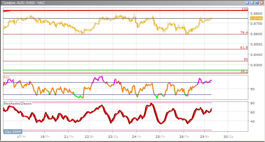 Пока что точка в 0,8822 для доллара Австралии является не достигаемой, он лишь слегка не доходит даже до сильного уровня в 0,8800. Сейчас он находится в канале между линией сопротивления и уровнем в 76,4% по Фибоначчи и пока возможности для прорыва не появляется. Если доллар США будет дальше слабеть, то австралиец наконец-то пробьет новую вершину, а если нет, то пробой канала будет вниз. По классическим индикаторам Stohastic указывает на восходящее движение, но не достаточно уверенно, а RSI находится в зоне перекупленности и ограничен в дальнейшем движении вверх. Поэтому совет покупать у края канала внизу около 76.4 % и продавать в районе 0.8800, при четких сигналах по индикаторам.