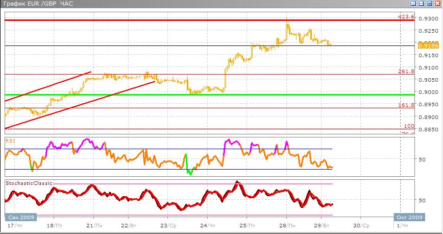 Данная валютная пара дошла до своего заветного максимума в 423,6% по Фибоначчи и даже его слегка пробила и сейчас откатывается к уровню в 261,8% по Фибоначчи, но возможно она до него не дойдет в ближайшие сутки и будет торговаться во флете, отдыхая от недавнего ралли. По индикаторам технического анализа ситуация не совсем ясная, т.к. Stohastic находится в серединной зоне и не дает четких сигналов на хороший вход в покупку, а RSI также не демонстрирует на подобную покупку. Но тем не менее, скорее всего будет сформирован сигнал на покупку в ближайшее время, но нужно быть осторожным, т.к. дальнейший тренд будет нисходящим.