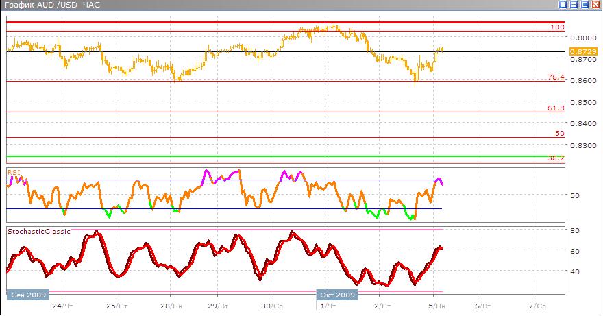 Сейчас намечается разворот который фиксируется классическими индикаторами Stohastic вот-вот совершит пересечение двух его скользящих медленной и быстрой, развернувшись в сторону продажи австралийского доллара. А RSI перейдя границу перекупленности разворачивается указывая на будущие продажи австралийца. Как только полностью сформируется сигнал по Stohastic можно будет рассчитывать на уверенный сигнал к продаже.