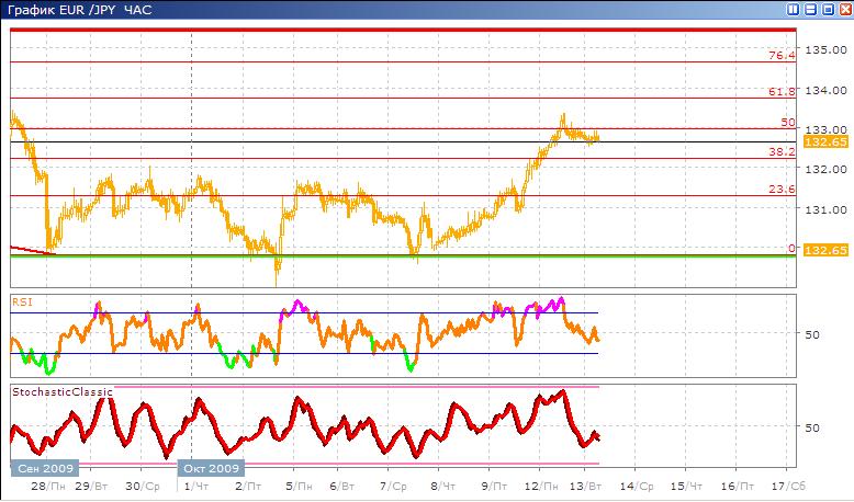 Stohastic пресек свои скользящие линии и указывает на покупку, RSI находится возле середины своего значения и торгуется в сторону покупки. Но так как сигнал не достаточно совместный, то нельзя его считать сильным. Желательно, подождать до более четкого сигнала по двум индикаторам.