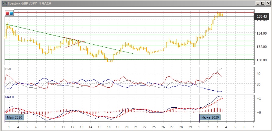 На дневном графике пара преодолела верхнюю границу канала 132-135. Исходя из размера канала в 300 пунктов, целью измеренного движения может быть уровень 138,00. Более сильное сопротивление на 140,00. Резкое преодоление крепкого уровня сопротивления 135,00 показывает, что тенденция роста сейчас сильная. По индикаторам направленного движения рост становится выраженной тенденцией: DM+ значительно выше DM- при повышающемся ADX, гистограмма MACD растёт в положительной зоне, линия MACD имеет положительный наклон.