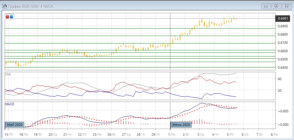 На четырёхчасовом графике у 0,7000 образовалось медвежье расхождение максимумов пары и гистограммы MACD. Это укрепляет сопротивление на уровне 0,7000 и увеличивает вероятность отката. Если рассматривать движение в диапазона с 3 июня, что пара может снизиться до уровня поддержки 0,6900, как это было в четверг. Последовательность роста относительных минимумов пары не нарушена: если это произойдёт, это может стать сигналом более существенного снижения. До фактического разворота рассчитывать на снижение ещё слишком рискованно. Рассчитывать на рост до преодоления уровня 0,7000 также рискованно, так как высока вероятность отката от этого уровня.