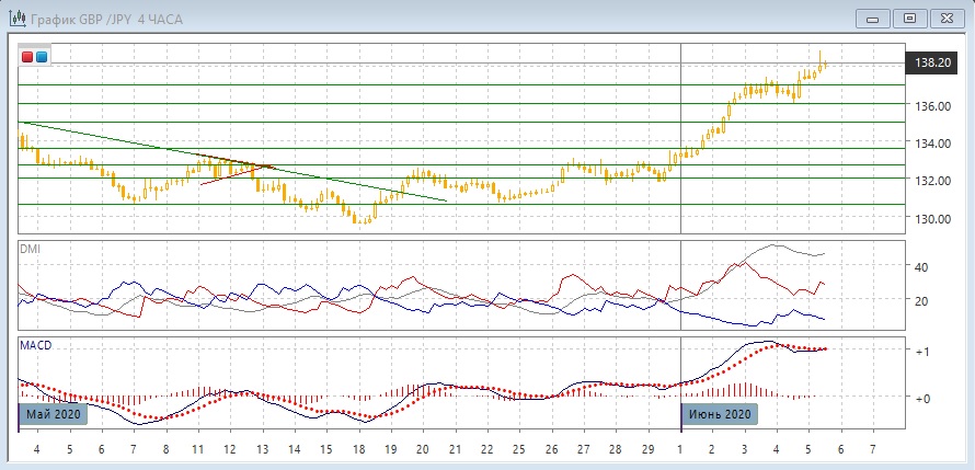 На четырёхчасовом графике рост замедляется, это видно по образования медвежьего расхождения максимумов пары и гистограммы MACD. Верхние тени свечей 4-5 июня могут говорить об ослаблении тенденции. По ADX тенденция роста остаётся очень сильной: превышение DM+ над DM- большое, ADX остаётся на высоком уровне. При откате поддержка может быть на ранее преодолённом сопротивлении 137,00.
