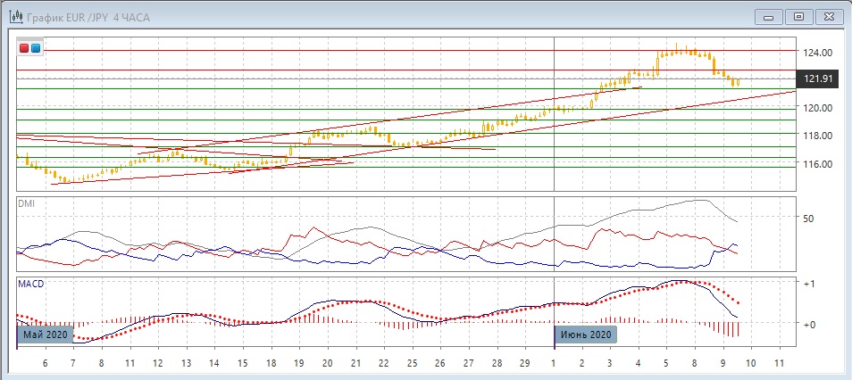 На четырёхчасовом графике произошёл разворот к снижению: пара преодолела предыдущий относительный минимум, моментом разворота было снижение после консолидации ниже 124,00, при этом образовалось пара проколов, подчеркивающих нежелание двигаться выше. Снижение 8 июня после отката от 124,00 было довольно резким, и можно предположить, что в ближайшей перспективе импульс сохранится. Пара может достигнуть восходящей линии тренда, если строить её с 14 мая. Уровень 122,50 8 июня выступил уже сопротивлением для пары. По индикаторам направленного движения тенденцией становится снижение: DM- пересеклась с DM+, гистограмма MACD снижается в отрицательной зоне, линия MACD получила отрицательный наклон.