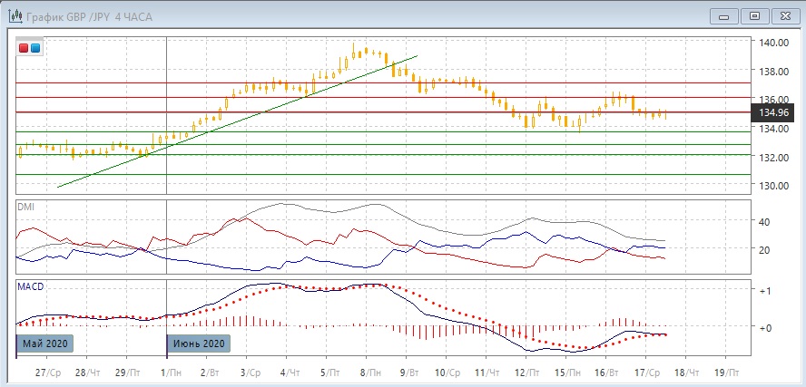 На четырёхчасовом графике можно выделить канал 134-136, исходя из этого можно ожидать снижения к нижней границе канала. С другой стороны отскок вверх с 15 июня встретил сопротивление на 136,00 - ранее линии шеи фигуры голова-плечи 3-10 июня. Это может подтверждать действие фигуры и делает более вероятным возобновление снижения.