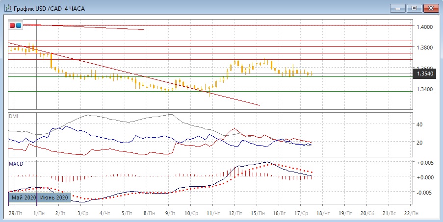 На четырёхчасовом графике пара остаётся в диапазоне 1,3500-1,3675. Три относительных минимума у 1,3500 с 12 июня и то, что ранее в начале июня пара удерживалась выше этого дня, показывает, что вероятность отскока в текущих условиях (когда тенденция снижения уже была нейтрализована) высока. При снижении ниже 1,3500 можно было бы ожидать возвращения к 1,3370 - поддержке 8-10 июня. Исходя из движения в канале 1,3500-1,3675 рост к верхней границе предпочтителен, но сохранение пары в нижней половины диапазона с 15 июня и то, что он выступает сопротивлением (16 июня ниже этого уровня образовалась близкая к "падающей звезде" свеча) повышает вероятность выхода из диапазона вниз.