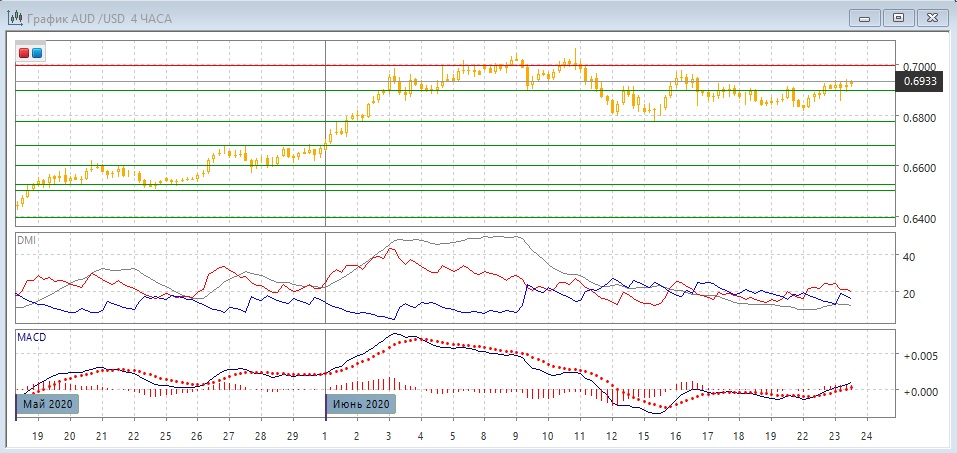 На четырёхчасовом графике продолжается движение в диапазоне 0,6775-0,7000. Сейчас идёт волна роста после приближения к 0,6800, и следующий "круглый" уровень 0,6900 выступил уже поддержкой 23 июня. По индикаторам направленного движения в этом сохраняется флэт: DM+ и DM- близки, ADX на низком уровне, гистограмма MACD остаётся около нуля. Образование "молота" в начале вторника может говорить во предпочтительности продолжения роста в пределах диапазона, пока пара выше 0,6900.