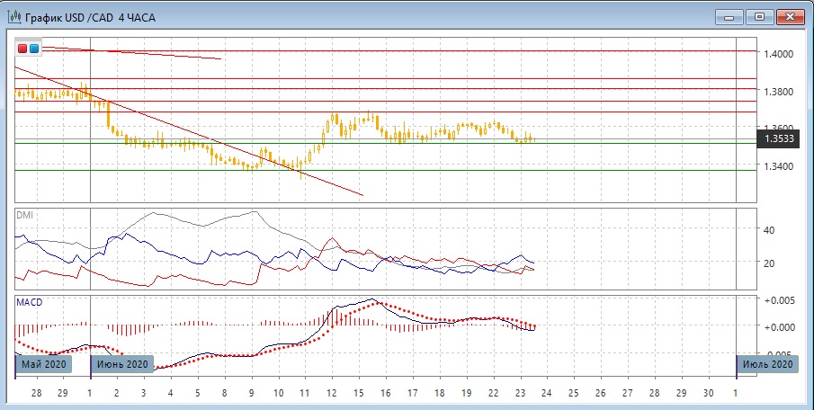 На четырёхчасовом графике пара остаётся в диапазоне 1,3500-1,3675, более узким диапазоном является 1,3500-1,2600. Пара довольно долго остаётся в узком диапазоне, что может ускорить движение в направлении выхода из него, когда этот выход случится. Исходят из движения в узком диапазоне, можно ожидать роста до 1,3600. Более вероятным видится выход из диапазона вниз. Тени у свечей с 16 июня преимущественно верхние. Небольшая "падающая звезда" выше 1,3600 в начале 22 июня может быть должный пробоем уровня 1,3600, что также повышает вероятность выхода из диапазона вниз. Но так как поддержка на 1,3500 сильная, но фактического преодоления этого уровня рассчитывать на снижение рискованно.
