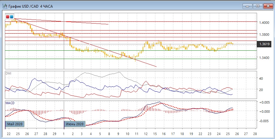 На дневном графике пара остаётся в границах 1,3500-1,3675. Отскок верх от 1,3500 привёл пару к близко к относительному максимуму 15 июня. Исходя из движения в узком диапазоне, более вероятно возвращение к 1,3500. По индикаторам направленного движения тенденции сейчас нет: DM+ и DM- близки, ADX на низком уровне. Более краткосрочные гистограмма MACD и линия MACD указывают на слабый рост, однако пока импульса для преодоления уровня 1,3675 не видно.