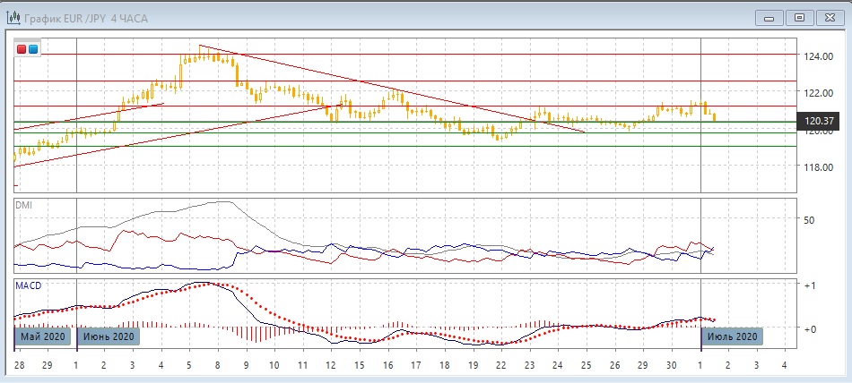 На четырёхчасовом графике, если рассматривать движение в диапазоне 119,75-121,20, целью движения сейчас может быть снижение к нижней границе, после тестирования уровня сопротивления 121,20 29 июня - 1 июля. Продолжение снижения облегчается, так как пара преодолела уровень относительного минимума 30 июня. По индикаторам направленного движения флэт: DM- и DM+ близки, ADX на относительно низком уровне, более краткосрочные индикаторы указывают на снижение: гистограмма MACD снижается, линия MACD развернулась вниз, но это остаётся в пределах колебаний второй половины июня.