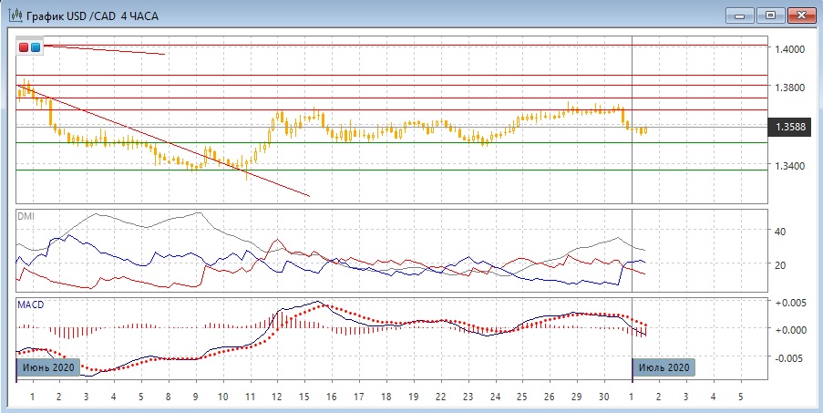 На дневном графике пара не удержалась выше предыдущего относительного максимума на 1,3675, и вернулась в диапазон второй половины июня 1,3500-1,3675. Если считать кратковременный выход выше 1,3675 ложным пробоем, сейчас более вероятным кажется движение к нижней границе диапазона 1,3500. По индикаторам направленного движения флэт: DM+ и DM- пересекаются, уровень ADX снизился ещё сильнее, более краткосрочные индикаторы указывают на рост: гистограмма MACD в положительной зоне, линия MACD имеет положительный наклон.