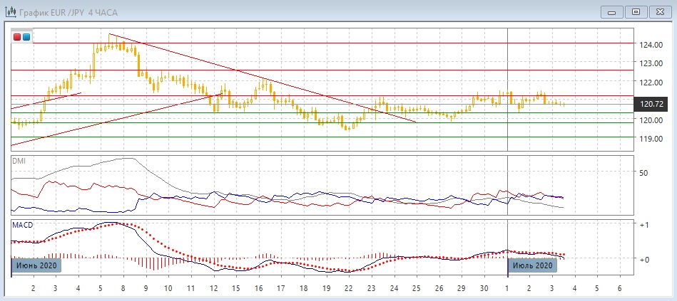 На четырёхчасовом графике у верхней границы диапазона 119,75-121,20 образовалось уже три вершины, это может быть разворотным сигналом. В рамках движения в диапазоне более вероятным видится снижение к нижней границе. По индикаторам направленного движения флэт: DM- и DM+ близки, ADX на низком уровне, более краткосрочные индикаторы указывают на снижение: гистограмма MACD снижается, линия MACD развернулась вниз, но это остаётся в пределах колебаний второй половины июня. В пятницу пара, вероятно, останется выше 120,30 из-за слабой активности из-за выходного в США.
