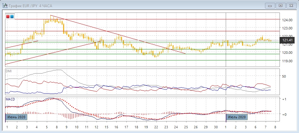 На четырёхчасовом графике пара консолидируется выше верхней границы диапазона 119,75-121,20. Преодоление уровня 121,20 и уровня трёх максимумов 29 июня - 2 июля, скорее, отменяет медвежий сигнал от тройной вершины и противоположное движение является, таким образом, бычьим сигналом. В понедельник пара снизилась от уровня 122,00 - там же было сопротивление 156 июня, после того пара снижалась. Возвращение ниже 121,20 вернуло бы пару в диапазон с предпочтительным движением к нижней границе на 119,75. Однако пока пара выше 121,20, вполне возможно развитие роста , цель исходя из размера диапазоне может быть на 122,55. Это соответствует максимумам 3-4 и 8 июня. По гистограмме MACD новый максимум пары не был подтвержден. Это увеличивает вероятность отката.