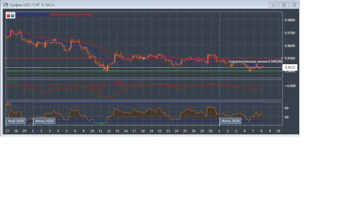 На четырёхчасовом графике скользящие средние с периодом 21 и 55 дней продолжают умеренно двигаться вниз и сохраняют расхождение. При этом график рынка развивается ниже экспоненциальных скользящих средних, что говорит о возможном нисходящем потенциале данного рынка в краткосрочной перспективе.