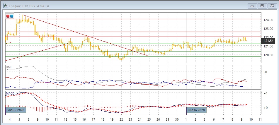 На четырёхчасовом графике пара обозначилось новое сопротивление на 122,00: около этого уровня образовывались относительные максимумы 6, 8 и 9 июля. Краткосрочный диапазон консолидации - 121,20-122,00. Исходя из движения в диапазоне, после отката от 122,00 пара, скорее, достигнет 121,20. По ADX в этом масштабе тенденцией стал рост: превышение DM+ над DM- существенное и устойчивое, ADX на высоком уровне. Вероятность разворота текущей тенденции увеличивается из-за образование медвежьего расхождения максимумов пары и гистограммы MACD. В это случае подтверждающими сигналом могло бы быть возвращение ниже 121,20.
