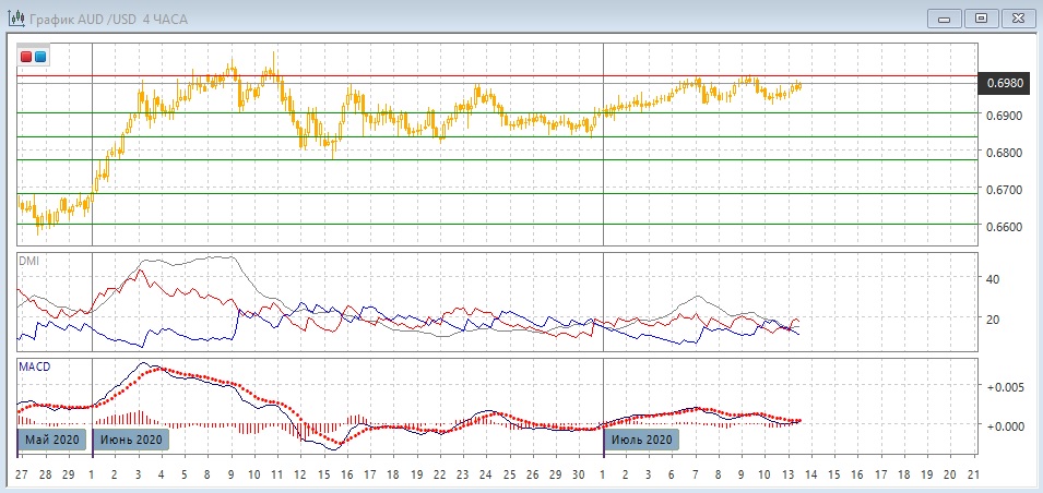 На четырёхчасовом графике пара также остаётся в диапазоне, в верхней границе. По индикаторам направленного движения флэт: DM+ и DM- пересекаются, гистограмма MACD колеблется около руля. В текущей ситуации не видно, чтобы у пары была возможность преодолеть важный с психологической точки зрения уровень 0,7000. Более вероятным сейчас кажется снижение от 0,70. В более узком диапазоне цель 0,6925 (у минимумов 7,8,10 июля), в более широкой перспективе - 0,6835, на минимумах с 16 июня.