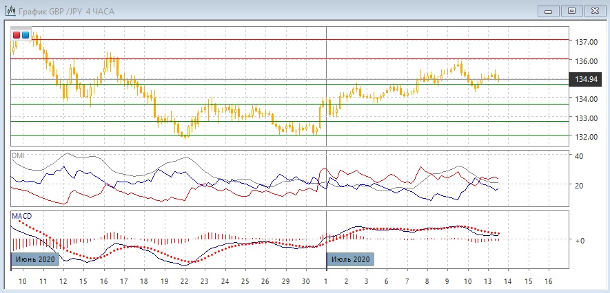 На четырёхчасовом графике образуется разворотная комбинация, которая подтвердилась бы при преодолении уровня 134,70 (это было бы линией шеи с 7 июля). Преодоление уровня 134,70 сделало бы следующей целью 133,65. 10 июля образовался более низкий, чем предыдущий, минимум. Относительный максимум 13 июля также был более низким, чем предыдущий. Это также является признаком возможного разворота.