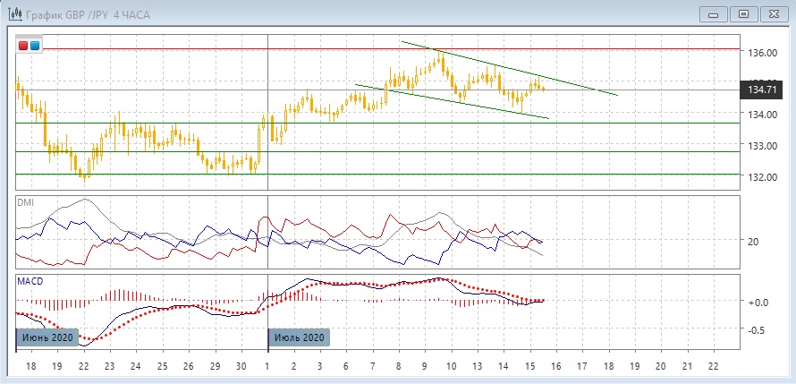 На четырёхчасовом графике пара снижается в нисходящем канале, и исходя их этой модели сейчас может быть снижение от верхней границы канала у 135 (ниже этого уровня образовалась "падающая звезда") к нижней границе, которая примерно соответствует уровню поддержки 134,00 (это также ближайший сильный уровень поддержки). Относительные максимумы и минимумы пары с 9 июля последовательно снижаются, это также является медвежьим сигналом. По индикаторам направленного движения в этом масштабе флэт: DM+ и DM- близки, ADX на очень низком уровне, гистограмма MACD около нуля, линия MACD примерно горизонтальна.