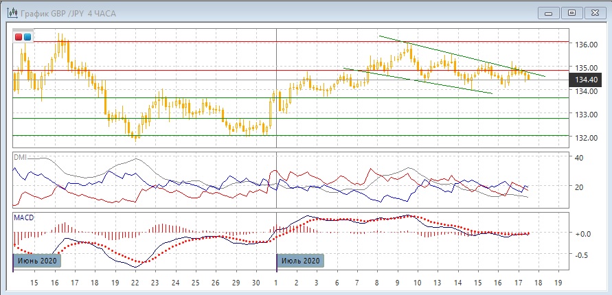На четырёхчасовом графике пара остаётся в более широком диапазоне 1,3500-1,3675, и более узком диапазон в июле 1,3500-1,3600. После восстановления от 1,3500 пара приблизилась к верхней границе более узкого диапазона 1,3600. Дальнейшее движение, вероятно, будет зависеть от того, преодолеет ли пара уровень 1,3600: если да, то это сделало бы целью следующее сопротивление на 1,3675. Однако приостановка движения ниже 1,3600 увеличивает вероятность отката обратно к 1,3500, как это не раз происходило с середины июня.