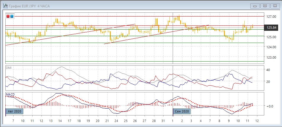На четырёхчасовом графике движение было ограничено уровнем 126,00, у которого образовалась "падающая звезда" 10 сентября. В краткосрочной перспективе движение, вероятно, будет зависеть от преодоления уровня 126,00 (если это случится, более вероятен дальнейший рост к верхней границе канала на 127,00). Если пара вернётся ниже 125,65, предпочтительным видится возвращение к нижней границе на 124,35.