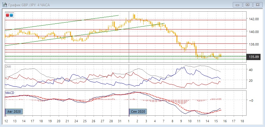 На четырёхчасовом графике происходит консолидация в узком диапазоне 135,55-137,65. Выход их неё скорее будет вниз, так как по форме это флаг, то есть фигура продолжения. Более краткосрочно стоит ожидать снижения к нижней границе, так как пара уже снизилась после приближения к верхней границе. По индикаторам направленного движения - коррекция к снижению: превышение DM- над DM+ сохраняется при высоком уровне ADX, гистограмма MACD выросла и находится в положительной зоне (хотя и на растёт), линия MACD получила положительный наклон..