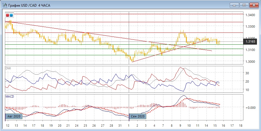 На четырёхчасовом графике происходит стабилизация: определилось сильное сопротивление на 1,3200 (уровень тестировался три дня), вновь проявилась поддержка на 1,3140 (как и 9-10 сентября). Если рассматривать движение в этом узком диапазоне, то предпочтительным является рост к верхней границе на 1,3200. Снижение пары ниже нескольких вариантов краткосрочного восходящего тренда не является бычьим признаком. Если смотреть шире, то пара пока может оставаться выше ближайшего "круглого" уровня 1,3100 и ниже сильного сопротивления на 1,3240, пока не появится какой-то катализатор движения.