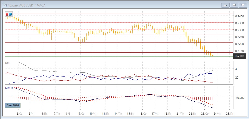 На четырёхчасовом графике пара вышла из диапазона и снижение является сейчас сильной тенденцией. Прорыв "круглого" уровня 0,7200 был резким, и пока тенденция только усиливается. По индикаторам направленного движения это подтверждается: превышение DM- над DM+ стало значительным при высоком уровне ADX, гистограмма MACD остаётся в отрицательной зоне, линия MACD имеет отрицательный наклон. Преодоление поддержки на 0,7130 (этот уровень не раз проявлялся в августе), которое видно в среду, предполагает, что предпочтительным является продолжение снижения.