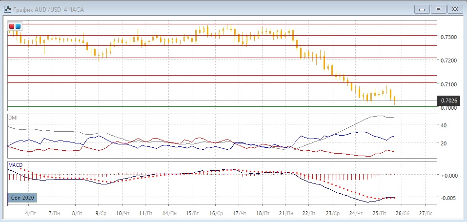 На четырёхчасовом графике коррекция вверх завершилась. Это делает более вероятным продолжение снижения, но для этого необходимо преодоления психологически важного уровня 0,7000. Поддержка на нём укрепляется из-за образования бычьего расхождения минимумов пары и гистограммы MACD. По ADX в этом масштабе тенденция снижется остаётся очень сильной. При восстановлении выше 0,7100 тенденция изменилась бы.