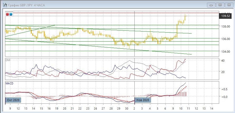 На дневном графике закрытие пары выше уровня 137,55, около которого с октября образовалось три вершины, и выше максимумов октября вывело пару из нисходящего канала (если строить его с начала октября) вверх. Теперь пара приблизилась к сопротивлению 140,00, которое проявлялось в августе. Также фактором сопротивления может стать примерно равенство волн роста с 22 сентября и с 30 октября - примерно 500 пунктов (цель измеренного движения - 139,40). Бычьим признаком является образование широкодиапазонной свечи роста в понедельник продолжение этого роста во вторник. Пока пара выше 137,55 (ранее преодолённый сильный уровень сопротивление), продолжение роста кажется предпочтительным. По индикаторам направленного движения пара перешла к росту: DM+ значительно выше DM- близки, гистограмма MACD растёт в положительной зоне, линия MACD получила положительный наклон..