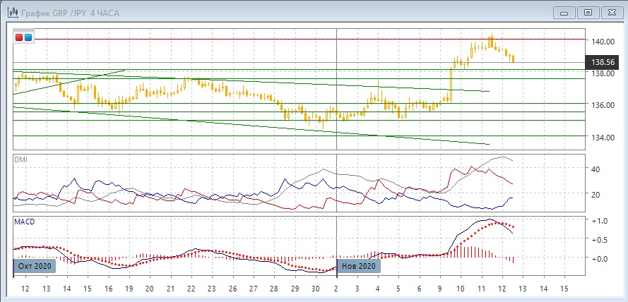 На четырёхчасовом графике по индикаторам направленного движения коррекция к росту: превышение DM+ над DM- сохраняется, ADX на высоком уровне, коррекция видна по снижению гистограммы MACD уже в отрицательной зоне и развороту линии MACD. В ближайшей перспективе, вероятно, снижение будет продолжаться, с ближайшей целью на 138,00.