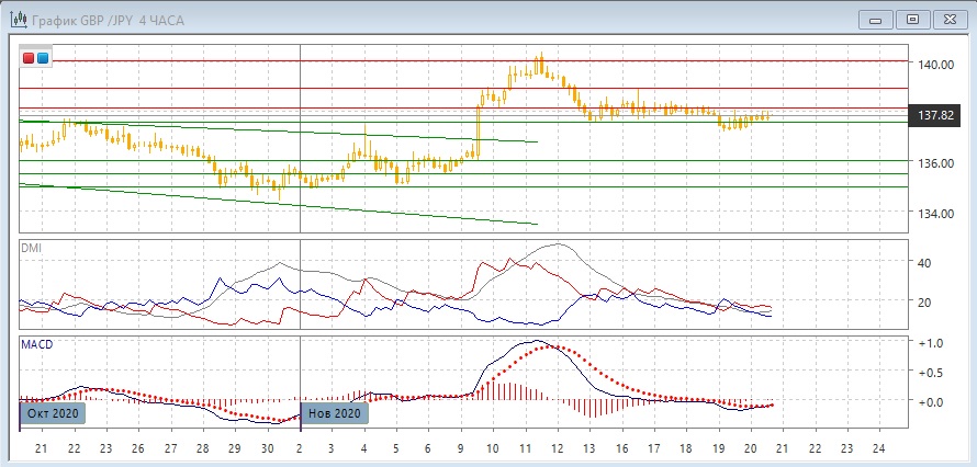 На дневном графике пара отката от 140,00 замедляется, пара остаётся выше уровня поддержки 137,55 (верхняя граница канала в октябре и начале ноября). Образование небольшого "молота" в четверг укрепляет поддержку на этом уровне. В целом размер движения за последние дни сократился - это может говорить о том, что в последние дни для ранее определённого периода переговоров по торговле после Brexit рынок занимает выжидательную позицию. По индикаторам направленного движения сохраняется коррекция к росту: DM+ выше DM-, но гистограмма MACD снижается, а линия MACD перешла к горизонтали. Пока пара выше 137,55, велика вероятность отскока вверх. И наоборот: если этот уровень будет преодолён, открылось бы возможность существенного снижения, со следующей сильной поддержкой на 136,00.