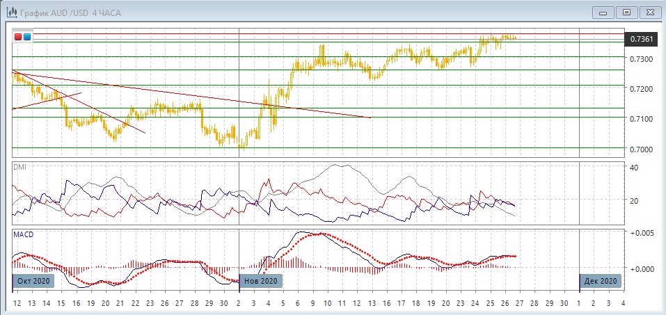 На четырёхчасовом графике пара консолидируется выше канала 0,7260-0,7350. Так как пара удерживается выше 0,7350, более вероятно продолжение роста. Исходя из размера канала в 90 пунктов целью видится уровень 0,7440. В ближайшей перспективе консолидация в узком диапазоне может продолжиться, так как активность на этой неделе, вероятно, будет низкой из-за Дня благодарения в США.
