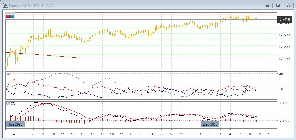 На дневном графике пара остаётся выше "круглого" уровня 0,7400, и таким образом, выше относительного максимума 30 ноября и выше максимума августа. Это оставляет предпочтительным продолжение роста. Последовательность роста относительных максимумов и минимумов пары не нарушена. По ADX тенденция роста остаётся сильной: превышение DM+ над DM- большое при высоком уровне ADX. Пара замедляется - это видно по снижению гистограммы MACD. Образование очередного медвежьего расхождения максимумов пары и гистограммы MACD увеличивает вероятность разворота, однако это этот сигнал не подтверждён. Таким сигналом могло бы быть возвращение ниже 0,7400, если это произойдёт. Целью виден психологически важный уровень 0,7500, которой который одновременно является целью модели двойного дна у 0,7000. Другими потенциальной увеличивающим вероятность отката фактором является значительный размер роста без значительных откатов - 450 пунктов. Однако пока пара выше 0,7400, продолжение роста кажется предпочтительным в краткосрочной перспективе.