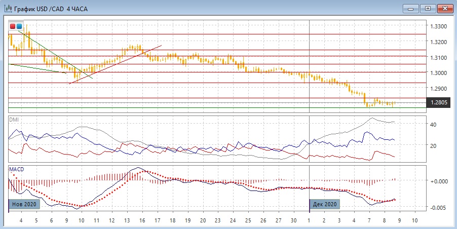 На четырёхчасовом графике происходит консолидация выше 1,2770, с центром около 1,2800. При этом образовалось бычье расхождения минимумов пары и гистограммы MACD, что увеличивает вероятность более существенного отскока. Подтверждения сигнала, однако, не было. При движении в текущей консолидации целью может быть уровень предыдущего максимума у 1,2830. По индикаторам направленного движения коррекция к снижению: по ADX тенденция снижения очень сильная, но более краткосрочные индикаторы говорят о возможном отскоке: гистограмма MACD растёт уже в положительной зоне, линия MACD получила положительный наклон.