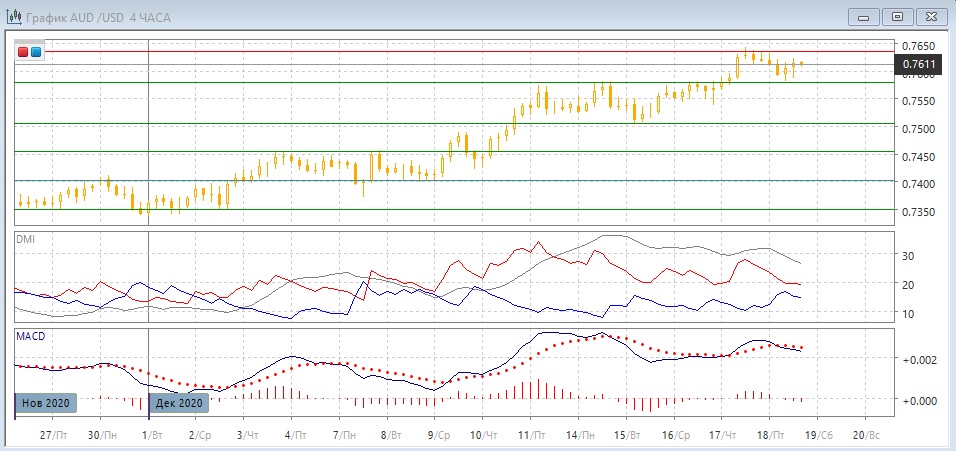 На дневном графике рост продолжился и пара преодолела следующий "круглый" уровень 0,7600. Это соответствует продолжению тенденции после образования "флага" 0,7500-0,7580. Сопротивление на 0,7580 в пятницу выступает уже поддержкой для пары. Последовательность роста относительных максимумов и минимумов сохраняется. Также сохраняется медвежье расхождение максимумов пары и гистограммы MACD, но как и ранее, подтверждения сигнала нет, и скорее рост будет продолжаться. По индикаторам направленного движения тенденцией остаётся рост: превышение DM+ над DM- очень большое при высоком уровне ADX, гистограмма MACD остаётся в положительной зоне, линия MACD сохраняет положительный наклон. Коррекция давно назрела, так как величина волны роста без существенных откатов приблизилась к 650 пунктам во величине и почти два месяца по длительности, однако эта же картина была и раньше, что не мешает росту пока продолжаться.