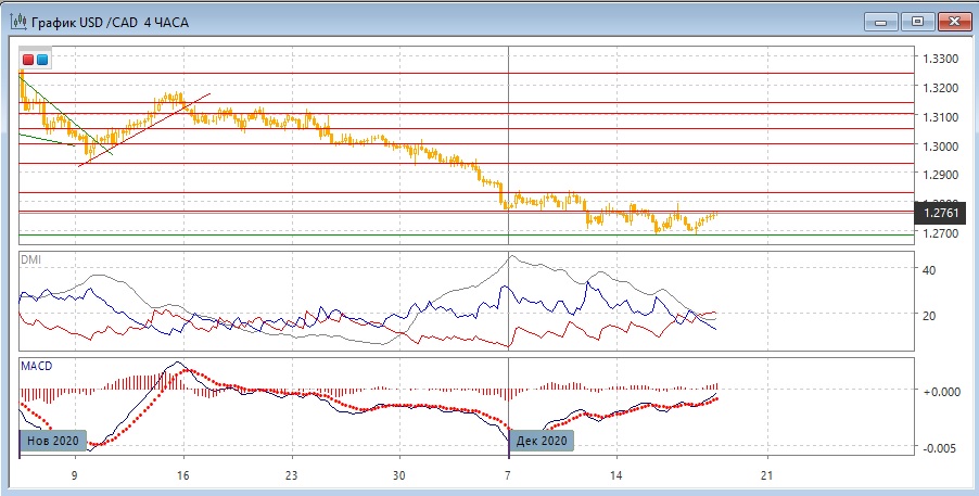 На дневном графике, возможно, дело идёт к отскоку вверх. Тенденция снижения замедляется - это видно по уменьшению наклона графика. Проявился новый уровень поддержки на 1,2690. После образования "молота" в четверг он может быть подтверждён свечой роста в пятницу. Ранее сигнал молота не подтверждался, что показывало силу тенденции снижения (движение в противоположную сигналу сторону). Подтверждением возможного отката может быть восстановление выше уровня поддержки в начале декабря на 1,2770. Однако сначала это должно произойти, и сейчас уровень 1,2770 является сопротивлением для пары.