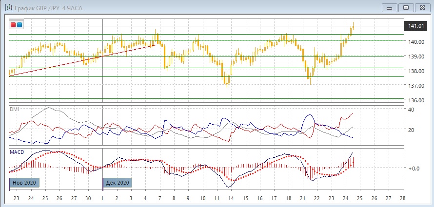 На четырёхчасовом графике пара выходит вверх из диапазона 137,55 - 140,40, прорыв сильный, рост может продолжаться. По индикаторам направленного движения рост стал сильной тенденцией: DM+ значительно выше DM- близки, уровень ADX восстановился, гистограмма MACD растёт в положительной зоне, линия MACD имеет положительный наклон. Пока пара выше 140,40, рост остаётся предпочтительным. Долгая задержка в диапазоне может привести к относительно сильному движению. Так как вблизи нет обоснованного сопротивления, это облегчает рост до целей на более крупном масштабе.