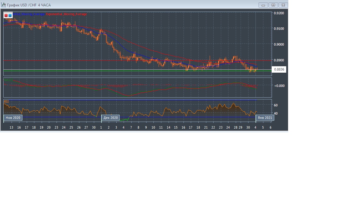 На четырёхчасовом графике скользящие средние с периодом 21 и 55 дней продолжают двигаться вниз, увеличивая расхождение, но наметили тенденцию к развороту вверх, что говорит в пользу зарождение бычьего сценария. При этом график рынка развивается ниже экспоненциальных скользящих средних, что демонстрирует медвежий потенциал у данного рынка в краткосрочной перспективе.
