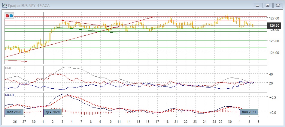 На четырёхчасовом графике в понедельник пара получила поддержку на уровне 126,00. снижение относительных максимумов и минимумов пары с 29 декабря продолжается. Сильное падение в начале года при показывает, что снижение даётся паре легко, и более вероятно, что снижение будет продолжаться до нижней границы диапазона, хотя есть риск отскока от сильного уровня поддержки 126,00 при сохранении флэта.