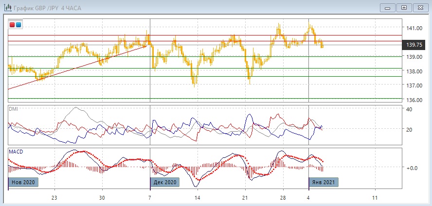 На дневном графике пара вернулась в диапазон с ноября 137,55-140,40 и она остаётся ниже верхней границы. Во вторник пара также может преодолеть уровень поддержки 140,00, что открыло бы пространство для более значительного снижения, возможно до 138,10. Ложный пробой верхней границы диапазона делает снижение к нижней границе предпочтительным. По индикаторам направленного движения пара остаётся во флэте: DM+ и DM- пересеваются, ADX на очень низком уровне, гистограмма MACD находится около нуля, линия MACD близка к горизонтали.