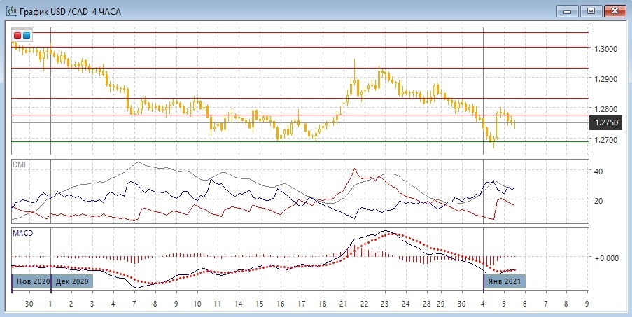 На четырёхчасовом графике резкий отскок вверх от минимумов декабря у 1,2690 может быть сигналом разворота. Сильный импульс обычно какое-то время продолжается. Текущее снижение от "круглого" уровня 1,2800 можно рассматривать как коррекцию к волна роста, в током случае в ближайшей перспективе пара, вероятно, вернётся к 1,2800. По индикаторам направленного движения сохраняется коррекция к снижению: превышение DM- над DM+ остаётся существенным, ADX на относительно высоком уровне. Коррекция видна по повышению гистограммы MACD и положительному наклону линии MACD (более краткосрочным индикаторам).