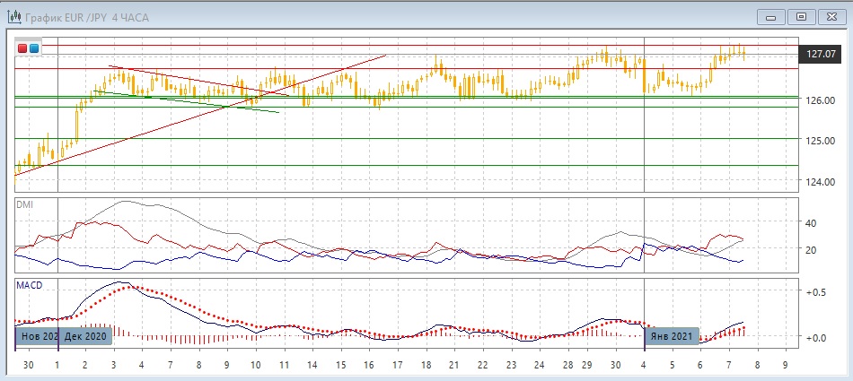 На четырёхчасовом графике пара возвращается ниже уровня 1,2700, потенциально это стать возвращением в более широкий диапазон, как было с конца декабря. Верхние тени свечей 6-7 января показывают, что рост не поддерживается, и скорее пара в краткосрочной перспективе будет снижаться. Закрепление ниже 127,00, если оно произойдёт, может привести к возвращению к 126,00 (уровень поддержки после откатов от 127,00 в декабре). Однако если пара восстановится выше 127,00, целью движения, равной размеру диапазоне, может быть 128,00.