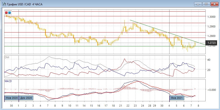 На четырёхчасовом графике пара восстанавливается выше уровня 1,2690, после образования пары "молотов" ниже этого уровня, который показали, что текущие снижения не поддерживаются. Если пара закрепится выше 1,2690, можно ожидать продолжения отскока к следующему уровню сопротивления на 1,2775. Ограничивающим фактором сейчас является краткосрочная линия тренда с конца декабря, пара приблизилась к ней. Преодоления линии тренда, если оно произойдёт, может облегчить дальнейший отскок.