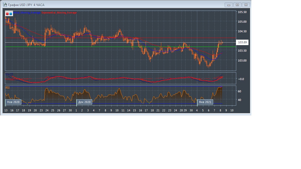 Скользящие средние с периодом 21 и 55 дней развернулись вверх, сократив расхождение до минимума и сформировали сигнал на покупку, где линия 21 пересекает линию 55 снизу вверх. Это так же является ярким подтверждением для развития восходящего сценария этого рынка в краткосрочной перспективе. Четырёхчасовой график прогрессирует значительно выше экспоненциальных скользящих средних, демонстрируя бычий потенциал рынка в краткосрочной перспективе.